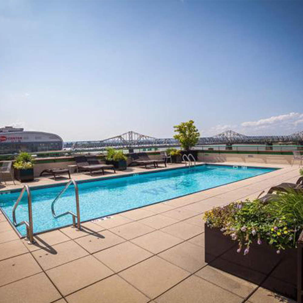 Immaculate Condo with Ohio River and Louisville Skyline views located on the 4th floor in Waterfront Park Place. This 2 bedroom, 2 full bath features hardwood floors, granite countertops, custom cabinetry, built in wood shelving in walk-in closets, open and spacious floor plan. Kitchen offers center island, stainless appliances and opens to dining area and great room. Huge Master suite with balcony and river views. Additional spacious 2nd bedroom and full bath. Enjoy all the amenities this building has to offer including rooftop pool with river views, fitness center, 24 hour attended lobby, Club room, party room , yoga room, and bike storage. This unit also comes with 2 parking spaces on the same level!